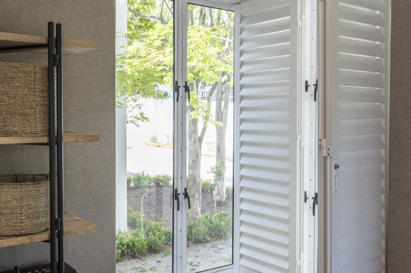 ShutterStyle® Shutters feature a 60mm bolt, sleek slide action, and push-lock system, offering both beauty and functionality. Made from slim yet robust aluminium, these shutters are suitable for indoor and outdoor use. They come with modular track options, a new light-blocking system, and seamless lines for a stylish look.